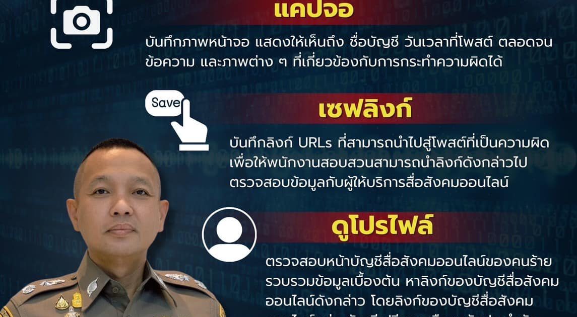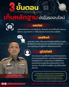 สำนักงานตำรวจแห่งชาติ จึงขอแนะนำ 3 ขั้นตอนเบื้องต้น ในการเก็บรวบรวมพยานหลักฐาน ก่อนที่จะไปแจ้งความร้องทุกข์ต่อพนักงานสอบสวน คือ “แคปจอ เซฟลิงก์ ดูโปรไฟล์” โดยมีรายละเอียดดังต่อไปนี้