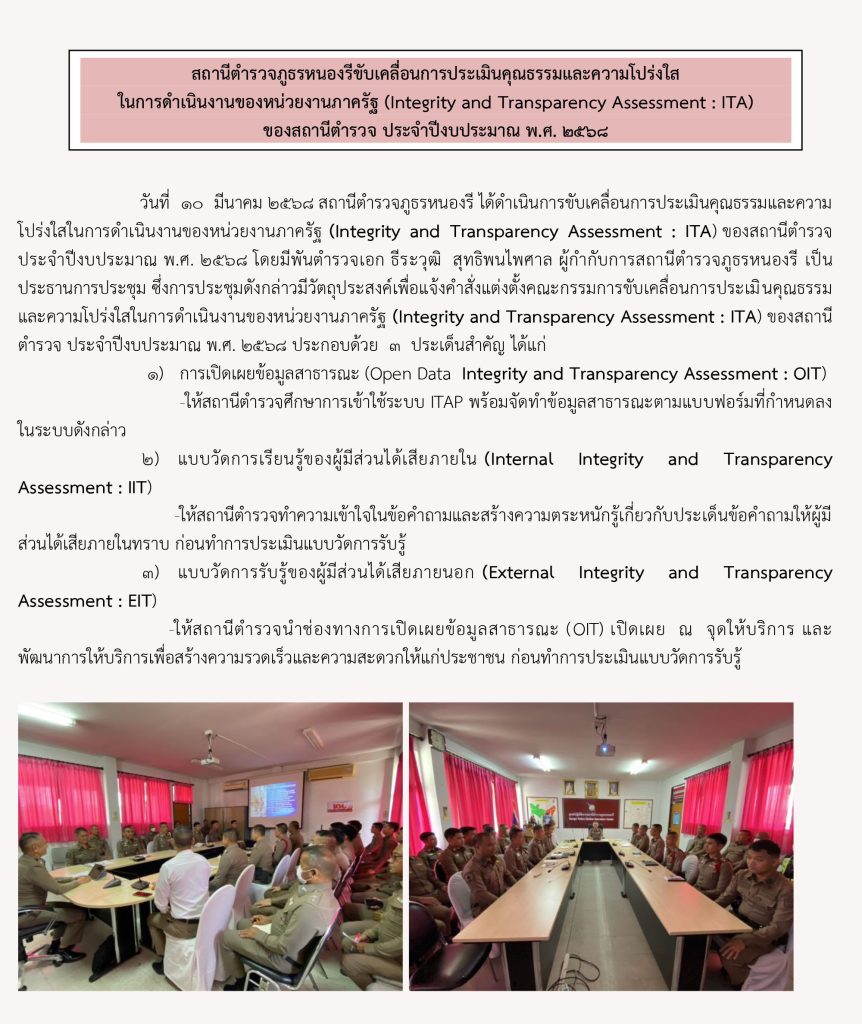 พ.ต.อ.ธีระวุฒิ สุทธิพนไพศาล ผกก.สภ.หนองรี ได้เรียกประชุมคณะทำงานประเมินคุณธรรมและความโปร่งใสในการด